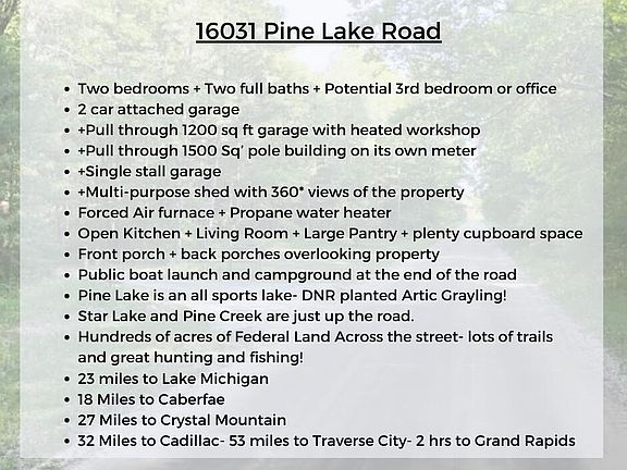 This cozy home boarders federal land at the beginning of Pine Lake Road which will lead you to all sports Pine Lake boat launch and campground. Paved drive leads you to 3 garages in the immediate vicinity. One large 2 car garage is attached to the home, a single stall garage which functions as a garden supply shed (16x25) and a 1200 sq' pull through garage and workshop, and cute finished in multi purpose shed with 360* views of the property. Out back is another 1500 sq ft Pole building with 12' ceilings and its own power meter. 2 bedrooms with potential 3rd, main floor laundry, pantry, open kitchen and living room on entire open basement sitting on 5 acres.