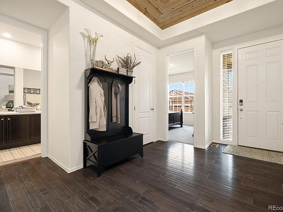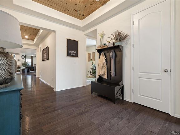 WOW! Exceptional Ranch with Incredible Finished Basement & Rare 4-Car Garage! This meticulously maintained 4-bed, 4-bath Lennar Springdale model offers a spacious, open layout with designer touches throughout. The inviting foyer leads to a gourmet kitchen with expanded cabinetry, a large island, huge pantry, and updated stainless appliances, flowing into the great room with a gas fireplace. A main-floor office with 9' French doors, mudroom, and separate laundry room add convenience. The primary suite features coffered ceilings, a luxurious bath, and sizable walk-in closet. The finished basement is the best you will see! It's built for entertaining with a huge family room, wet bar with cabinetry & fridge, plus a guest room & a 3/4 spa-like bath and walk-in steam shower. It also offers a flex space that is perfect for a home gym, playroom, or second office, with ample storage as well. Enjoy Colorado outdoor living on the covered Trex deck, extended patio, and beautifully landscaped yard. The rare 4-car garage offers space for vehicles, toys, or hobbies. Additional special touches include custom paint, barn door in primary, statement walls, wainscoting, radon mitigation, solar, floor to ceiling stone fireplace surround,**2 sheds and more. Located in Orchard Farms, with a 5-acre park, playground, pavilion, and tennis courts, plus easy access to Denver, DIA, and Orchard Town Center. A must-see—schedule your tour today!