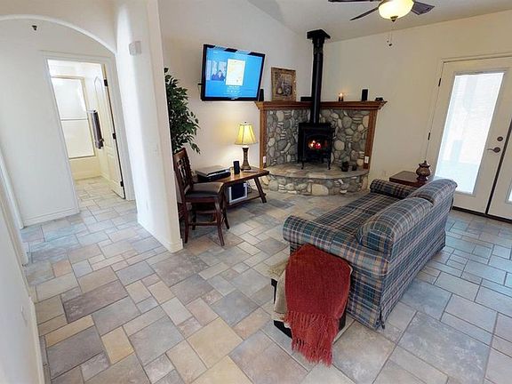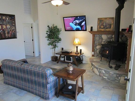 Beautiful custom home with vaulted ceilings and modern split and open floor plan. This gorgeous home was built by a contractor for his own personal residence. the home is turn key/move in ready, featuring 4 bedroom & 2 baths and priced to sell. There is a wood burning stove in the living room for those cozy evenings with the family. The kitchen and baths have sleek one piece easy care corian type counter tops with beautiful cabinets. The formal dining room has a coffered ceiling with a chandelier as a center piece surrounded by recessed lighting. There are ceiling fans in all bedrooms, living room and breakfast nook. The indoor laundry has a convenient sink for those quick cleanups and cabinets for storage.The master bedroom has a double door entry with a large walk in closet along with an exit door to the large covered patio. The master bath has double sinks with a separate built in vanity and separate luxurious tub and shower and a private water closet. There are crisp white plantation shutters throughout this lovely home for your privacy and temperature control. You'll have the security and convenience of an electric driveway entrance gate and garage door opener.