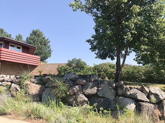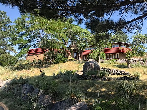 If you like unique, this Frank Lloyd Wright style house is truly a rare find on approx. 1.2 acres!! 3 bdrm, 2 bath split-foyer offers living room w/adjacent terrace, kitchen, dining, primary bdrm w/full bath,nursery & office. LL offers family rm, 1 conforming bdrm, full bath, play area, storage & laundry. Front of the home and driveway are off cul-de-sac with so much privacy & the view is amazing from the hilltop paradise! Balcony, terraces, rock walls & paths for your outdoor pleasure!! Total Lot Size is approx. 1.2 acres. Legal Description: Lot 15A, Lots 15 & 16 and W 71.96' Lot 17, Block 1, Hilltop Addition & Cactus Heights Addition and Dimmicks Outlot #1 Less N 125' Part of SW Sec 34 111-79, City of Pierre, Hughes Co., SD. Supplement: -Dining Room w/ banquette seating -Many built ins including: Bar w/metal lining Hallway closet system entire length of hall Generous entry closet Primary Bedroom  3 generous closets Study & shelves galore & built in desk Built in bench -Rooms: 2 bedrooms 2 full baths Kitchen  2 parts Dining Living (sunken) Nursery (library) Study -Lower Level: Family Room Bedroom Bath Bonus Room Laundry (huge) Doors Under stairway lead to a wine cellar -Outside: Balcony Terrace Private Patio (Could be used as pickle ball court or fire pit area) Many rock walls/walks Luxury waterproof vinyl installed in 2018. Colored concrete, California redwood (doesn't rot, beautiful) and glass are the materials used.