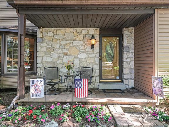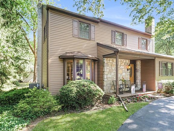 Beautiful 4 Br 2.5 baths Story Center hall Colonial with covered front porch and stone entry facade. Etched oval, beveled glass front door opens to formal entry with slate floor & leads to both the Family room and formal Living room. Formal LR offers large casement bay window, hardwood floors &large cased opening to formal Dining room with hardwood floors & large casement bay window with view of backyard. Dining room opens to Eat-in Kitchen that features ceramic tile floor, custom solid oak & wrap around glass front cabinetry, Corian counter top, built-in dishwasher, double stainless steel under mount sink, Cerran glass top range & overhead microwave that opens into separate eating area with sliding door to 30 x 12 concrete patio. Eating area opens to Family room featuring custom entertainment built-ins, brick masonry fireplace with built-in shelving to each side of the fireplace, custom wood plank walls and Berber carpeting. Laundry/mudroom and powder room off Kitchen with access to covered back porch and to 2 car side entry garage. Hardwood floors t/o 2nd floor. Large Master Bedroom with deep walk-in closet and Master Bath. 3 additional roomy bedrooms with double closets. Hall bath with tub shower combination. Full basement with new heat pump just installed and oil back up heat. Beautiful backyard, circular driveway and additional parking to 2 car side entry garage.