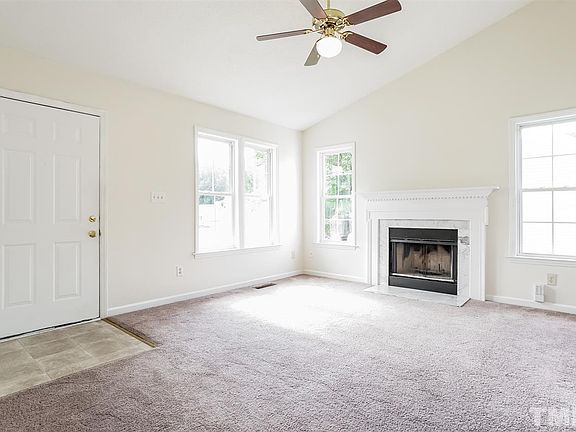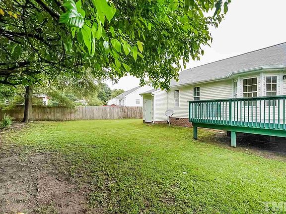 This Raleigh one-story home offers a fireplace, master bath dual sinks, a master bedroom walk-in closet, and a deck.