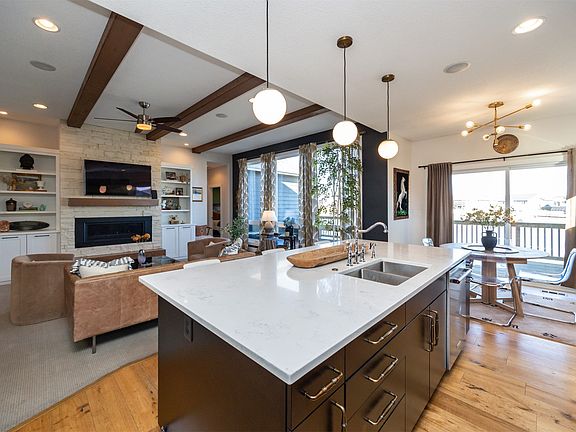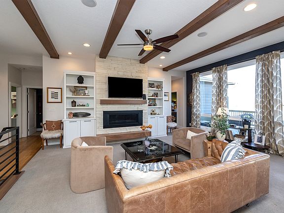 Welcome to this stunning custom built ranch home at the end of a culdesac, backing to a pond! As you step inside, the great room welcomes you with soaring 10-ft ceilings with wood beams, a cozy gas fireplace, and stunning floor-to-ceiling windows that frame the breathtaking view of the pond. Enjoy zoned heating and cooling for full comfort all year round, plus built-in speakers throughout the great room, deck, basement, and garage with volume controls in each room.The kitchen features LVP floors, center island, quartz countertops, and Kitchenaid appliances, all included. The dining area is right off the kitchen, leading to a large, partially covered deck with a stone gas fireplace, overlooking the fully fenced backyard and stocked pond. Convenient drop zone / laundry room off the oversized 3-car garage. Washer/dryer also stays! The primary suite is tucked away, a perfect retreat with your own pond view and spa-like bathroom featuring a full tiled shower, dual sink vanity, and walk-in closet. 2 additional bedrooms and full bathroom complete the main level. Heading downstairs to the daylight lower level, you'll find a large family room with wet bar, ideal for hosting game night. 2 additional bedrooms, full bathroom, and plenty of storage. The location couldn't be better with a new elementary school being built just around the corner. This home is truly a must-see!