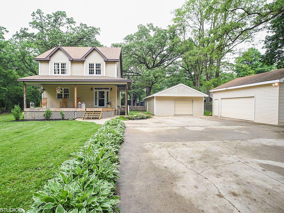 Spend summer days having morning coffee or afternoon BBQs on the extensive front porch. This spectacular farmhouse exhibits gorgeous woodwork, wide trim and hardwood floors. Splendid kitchen with two-tone cabinets and SS appliances opens to a large great room with dining area. 1st floor full bath. 3 Bedrooms on the 2nd floor and a full bath with exquisite oversized tiled shower and tub. Master bedroom boasts vaulted ceiling and a walking closet. Immense room in the attic can be converted to the 4th bedroom or serve as a flex room. Partially finished basement with access to outdoor is awaiting your finishing touches. 3 car garage with plenty of extra storage space/workshop area & a huge concrete driveway. Country living at its best on a professionally landscaped 0.9 acre wooded lot featuring raised vegetable garden beds. Come see it today!