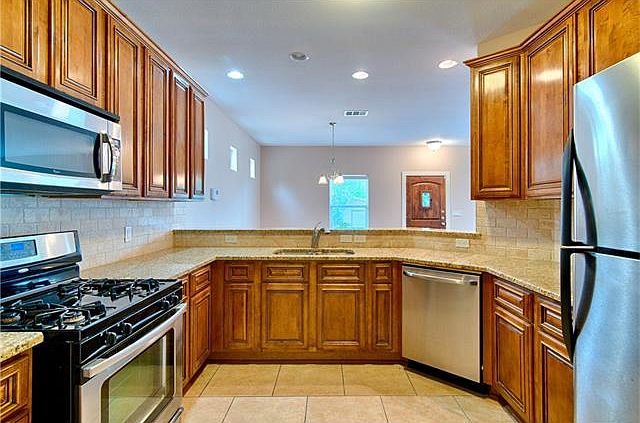 High end custom home located minutes from Downtown and UT. You can bike to light rail and entertainment venues. The open floor plan comes equipped with 18 inch tiled flooring, granite countertops, travertine back splash, and stainless steel appliances. The master suite has it's own private terrace and master bath with stand up shower, dual vanity sinks, and travertine tile. (Note: this is not a condo or duplex. It is a single family residence. No shared walls.)