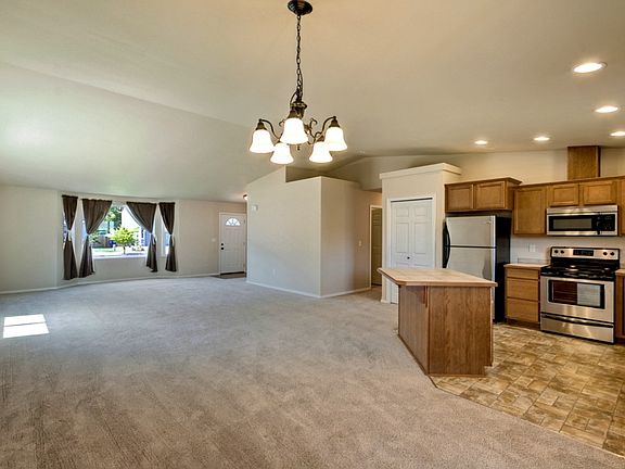 Open concept 2010 built rambler with nice fenced yard that includes a sprinkler system. Great room concept with bay window, open Kitchen with stainless steel appliances, pantry, dining area with slider to fenced yard and covered 220 sq ft patio. Master with 2 closets and private bath. Good sized Laundry room. A/C. 2 car garage is good sized. Kitchen was recently updated.