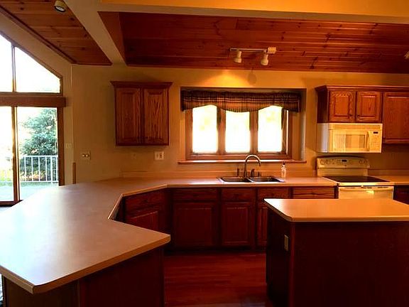 Location, Location! Large 4-bedroom, 4-bath home on a wooded lot on the edge of town. This home borders a wooded area in the Kings Hill Estates. Wooded back yard makes you feel like you are in the country, but you are only minutes from the school complex and the downtown area. Enjoy quite evenings out on the patio and fenced yard. Open living, dining, and large kitchen with hardwood floors, large breakfast bar, and wooden cathedral ceilings. Wood fireplace, large entryway, and huge pantry. Main-floor laundry, master suite with walk-in closet, and master bath with a garden tub and shower. 2 additional bedrooms with full bath on second level. Large rec room in the basement with wet bar, 1/2 bath, workshop area and lots of storage.