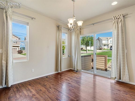 A beautiful 4 bed/4 bath in Northgate! This D20 home has amazing Pike Peak views and located on a corner lot. Upon entry take in the grand main level with high ceilings and hardwood floors. A spacious kitchen awaits with working island, granite countertops and stainless steel appliances. Just off the kitchen you can relax in the living room with large windows and gas fireplace- perfect for those fall and winter evenings! Upstairs you'll notice all the natural light and mountain views as you make your way to the primary suite. Highlights include a unique tray ceiling, Pikes Peak views and large walk-in closet! The en-suite primary bath is your own personal spa with the oversized wall-to-wall shower, two showerheads and double vanity. Two additional beds, full bath and convenient laundry complete the upper level. Ready to watch the big game or hosting out of town guest for the upcoming holidays? Head down to the full finished basement where you'll find a large family room with wet bar! They will have their own personal space down here with a large bedroom, full bath, and second laundry space. Outside, this home is steps from a cute park and has easy access to tons of shopping and entertaining. You don't want to miss an opportunity like this- book your showing today!
