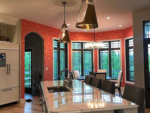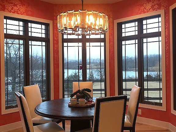 Modern executive Frank loyd right Prarie style home with walkout basement, 2 fire places, Open area with kitchen, dining and living room all Open. With vaulted 13 foot ceiling and 12 Foot domed Ceiling from large stained glass French door entrance. 10 ft ceilings on both levels. Custom cabinets in kitchen and pantry with marble back splashes. Also a custom range hood with blower that is barrel shaped gun metal with rivets going to ceiling. House has full led lighting and all walls are spray foam insulated and the main floor in basement under the concrete has insulated foam. The house also full foamed with blown insulation. We also have a a/c and furnace with geothermal lines. The large master bed room with walkout closet and master bath with tub and rain shower. Full kitchen with large island and gas cooktop and 2 ovens and grille. Large dinner table with views of the lake. 450 square foot Under storage garage with garage door opener below the 3 car garage on main level. Wrap around deck in back with poured cement floor, with full Views of the lake and pool below.