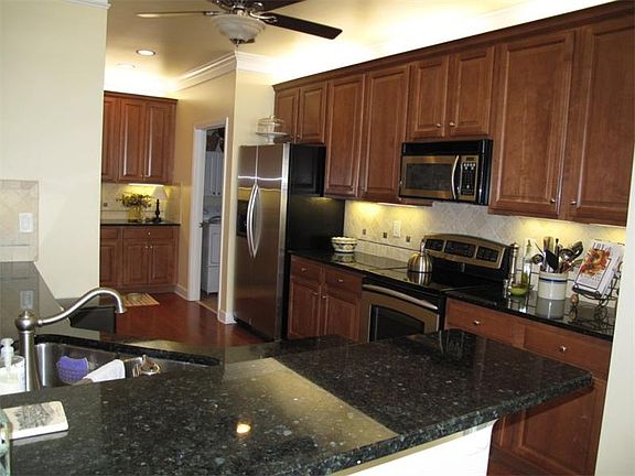 Unique floor plan in this neighborhood with upgrades galore! Newer wood floors throughout main living area and master bedroom. Kitchen has granite and stainless appliances (two ovens!). Fireside keeping/breakfast room, large master, walk-in closet and private fenced patio.
