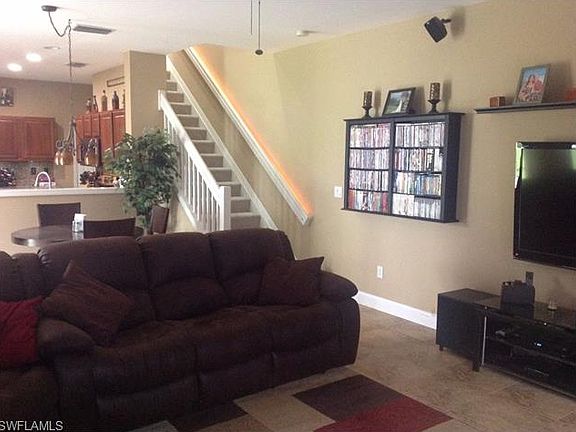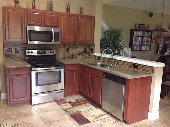 Rarely available end unit in Milano community in North Naples. Beautifully appointed upgrades throughout this gorgeous 3 bed 2 and 1/2 bath townhome. As you enter the residence you are welcomed with large stone look porcelain tiles, kitchen boasts upgraded cabinets, granite countertops, hand made Italian glass tile backsplash. Brand new Kenmore stainless steel range, microwave and dishwasher, side by side fridge is less than 3 years old. The large first floor open layout includes an eat in kitchen, dining area, and living room which is pre-wired for a surround sound make it great for entertaining. The half bath is also in the ground floor. The lanai is equipped with Florida screen on the top to keep you dry, and sun shades help keep you cool as you enjoy a nice cookout with friends. Soft carpeting and rope lighting along the stair rail take you to the second floor. The second master/guest bath has upgraded cabinets, granite tops, Italian porcelain tile and double accent borders in the tub/shower combo. The master bath includes large porcelain tiles on the floor, a double sink counter top with dark wood cabinets and 6x6 bright white ceramic tiles. Washer and dryer in hallway.