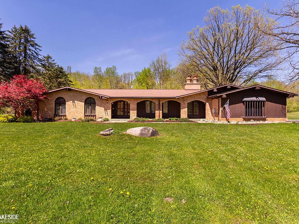 Beautiful family sized Spanish ranch on 6 gorgeous acres! Double door entry into slate foyer with double coat closets; kitchen offers snack bar seating, double built-in ovens, glass top range, newer vinyl plank flooring; breakfast nook with French doors to covered porch; family room with natural fireplace w/woodburning insert & doorwall to covered porch; formal dining rm w/French doors to covered front porch; sunken living rm w/huge picture windows; large laundry room w/2 double closets for loads of storage space; arched entry to game room w/doorwall to patio; double door master suite w/walk-in closet & French doors to private patio, bath w/ceramic floor; full family bath w/ceramic floor & shower; Jack & Jill half bath; 4 more bedrooms; 2.5 car garage w/2 access doors; covered arched front porch true to Spanish architectural style, all situated on 6 park-like acres with huge pond, backing to wooded area. One of a kind offering, spacious enough for relaxed living yet room to entertain friends and family!
