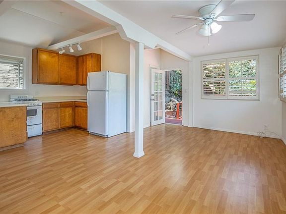 Often referred to as the Laguna Canyon Treehouse, this unique home offers a rare retreat surrounded by panoramic canyon and hillside views. Tucked away in a secluded setting, the property features laminate flooring throughout, plantation shutters, beamed ceilings, a well-appointed kitchen, and a clean, updated bathroom. The bedroom is cozy in size but offers generous closet space. While there are steps leading up to the home, the spacious deck and sweeping views make the journey well worth it. Utilities including water, trash, gas, and electric are all included. Convenient open parking is available directly across the street.