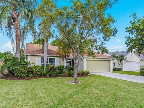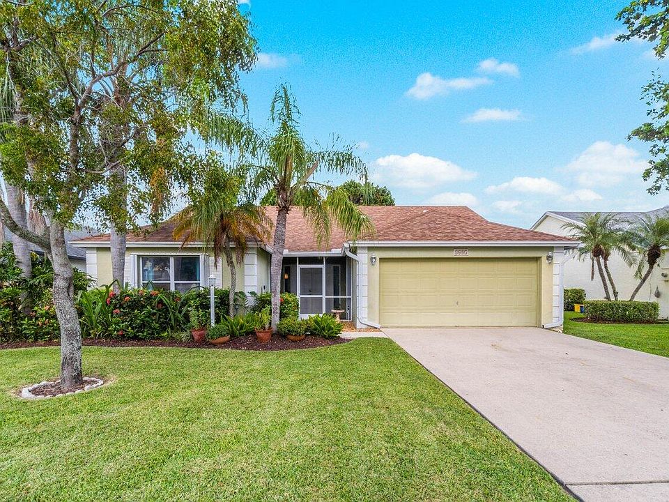 Welcome to this lovely 3 bedroom, 2 bath home in the gated community of Meadowland Cove. Nestled in the heart of Wellington and minutes from the polo and equestrian areas, this low HOA community is the ideal place to call home. The light and bright entryway opens up to a spacious living area with vaulted ceilings, new wood plank tile floors and new baseboards throughout. The renovated kitchen features quartz countertops, stainless steel appliances, an island and space for additional seating. The split floor plan provides open areas and privacy between the bedrooms. The airy primary suite features a spacious walk-in closet and updated bath including separate shower and soaker tub. Continue outside to the screened in covered patio, an ideal space for dining and entertaining. The backyard is completely fenced in with mature trees offering shade and privacy. The home has complete accordion and panel shutters. Major replacements within the last few years include the roof in 2019, a/c in 2018 and water heater in 2019. Enjoy the community pool and boat ramp that accesses beautiful Lake Wellington.