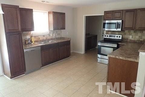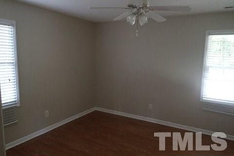 The house has a nice open floor plan, with laminate floors throughout, a brickfireplace in the living room, it has updated bathrooms, and a fenced yard with apatio and trees.