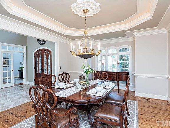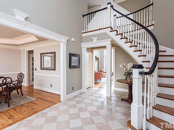 Stunning custom estate home close to 540 & RTP. 1st flr master w/beautiful view of wooded landscape. Kitchen is a chef's dream opening to entertaining space w/2-sided fireplace. Interior awash in natural light. Finished basement perfect for entertaining & features a temperature controlled wine cellar, kitchenette, BR & BA. Perfect for an in-law suite with separate entrance at ground level and a separate garage. HVAC replaced in 2016 and water softener added. Enormous backyard. Can join Stonemoor pool.