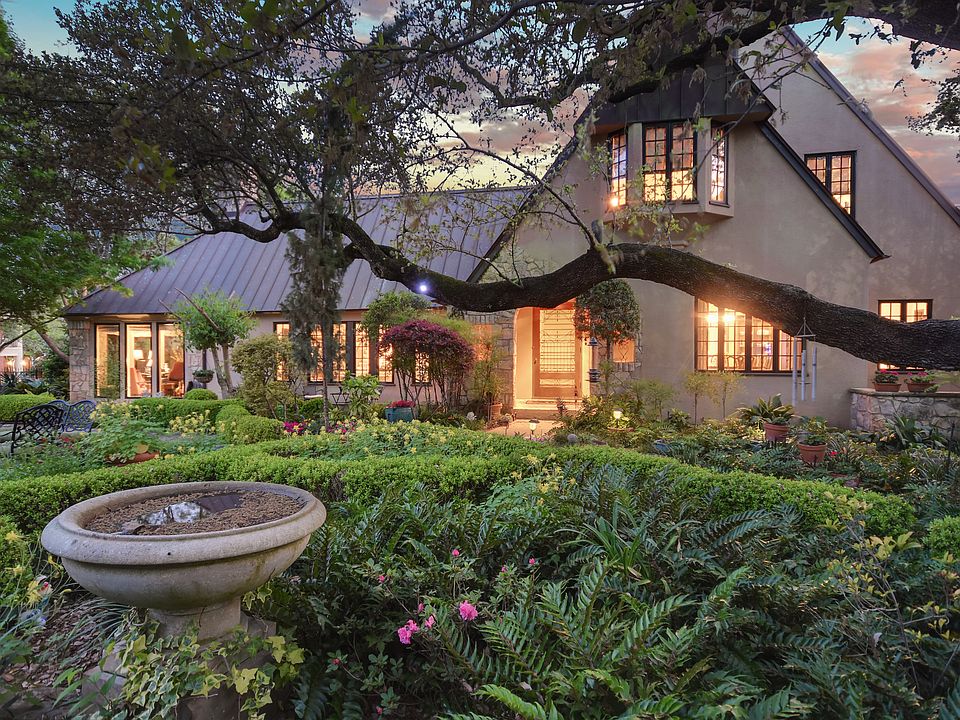 Enchanting 1927 home in Old Enfield at the corner of Niles and Pease Rd, remodeled by master craftsmen and artisans from near and far. Stone/stucco exterior, metal roof, 3 stories. Close to downtown, hike and bike trails and UT. Large living/entertaining areas with banks of floor to ceiling windows, soaring ceilings and wet bar overlooking pool. Paneled library with fireplace, wine room, kitchen, second "catering room" with private entrance and morning room. Lower level could be guest apartment with full bath, exercise room, office or 5th bedroom with sitting area. Original Weigl Iron Works in stairwells and throughout the grounds. Stunning gardens feature stepping stones leading to private seating areas, rare species of trees and plants and a beloved heritage tree.