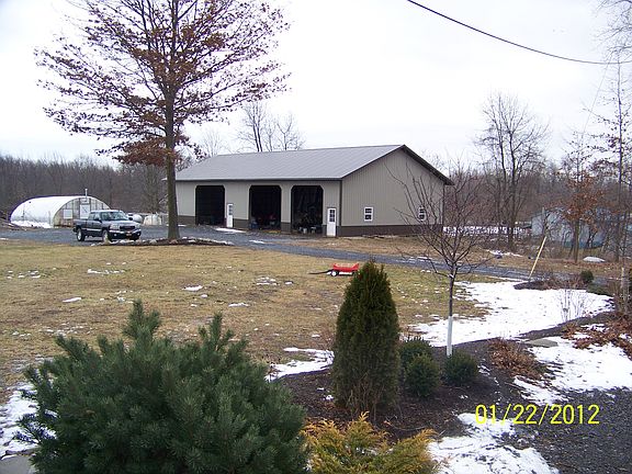 has a 3 year old big 40-80 shop or use it for a barn as it is attached to the pasture pen for chickens pasture big enough for horses big 1.5 acre garden certified organic could be turned into pasture as well nice big lawn lots of trees, fully landscaped, close to Geneva thruway exit half hour to both Rochester an Syracuse area .