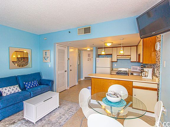 Step into this charming condo and be greeted by tile flooring throughout, creating a cool and coastal atmosphere. The walls adorned in a serene blue hue and coastal decor further enhance the beach-inspired ambiance.   Fully furnished and thoughtfully designed, this condo features a comfortable queen-size bed and a full-size sleeper sofa, accommodating up to 4 guests. The layout is carefully crafted to maximize space and provide a cozy retreat for your stay.  One of the highlights of this oceanfront condo is its oversized kitchen—a rare find among studio units. Enjoy the convenience of ample counter space and storage, making meal preparation a breeze. Whether you're whipping up a quick breakfast or indulging in a home-cooked dinner, this well-equipped kitchen has everything you need.  Located within the Palace Resort, this condo offers more than just stunning ocean views. The resort is conveniently situated only 1 mile from the MYR International Airport and the Coastal Grand Mall, ensuring easy accessibility for travelers. A brand new Walmart recently opened around the corner, providing additional convenience for your shopping needs. Numerous dining options are also within close proximity, allowing you to savor a variety of cuisines.  The location of the Palace Resort is truly advantageous, offering proximity to a plethora of attractions, shopping destinations, dining establishments, theaters, mini-golf courses, go-kart tracks, golf courses, and fishing spots. Immerse yourself in the vibrant entertainment scene and make the most of your time in this coastal paradise.  Don't miss out on the opportunity to own this Oceanfront Efficiency Unit on the 16th floor. With its coastal-inspired decor, fully furnished layout, oversized kitchen, and convenient location, this condo offers the perfect blend of comfort, style, and accessibility. Schedule a showing today and add this to your rental portfolio.