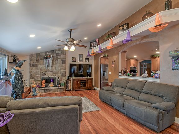 Cozy fireplaceFire pitLarge walk-in pantryLarge rangeGleaming hardwood floorsStylish tile backsplashAbundance of cabinet storage