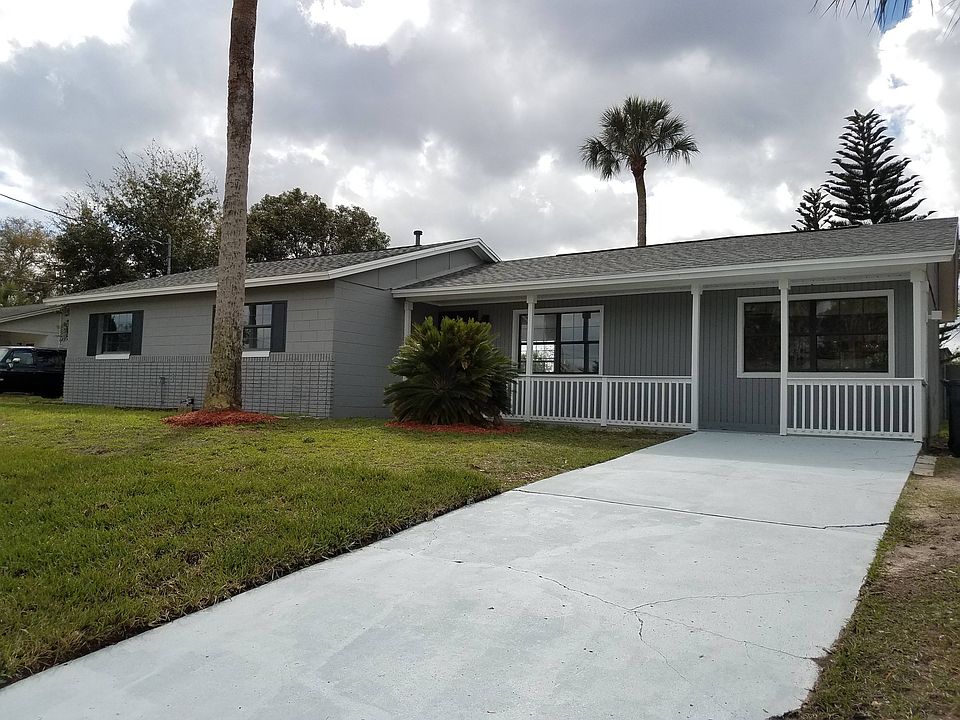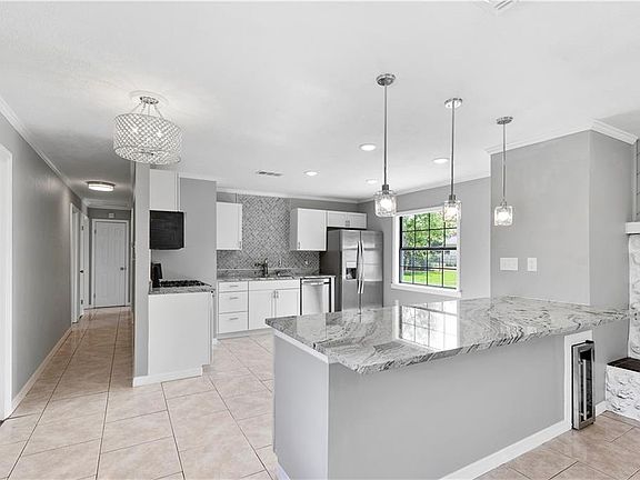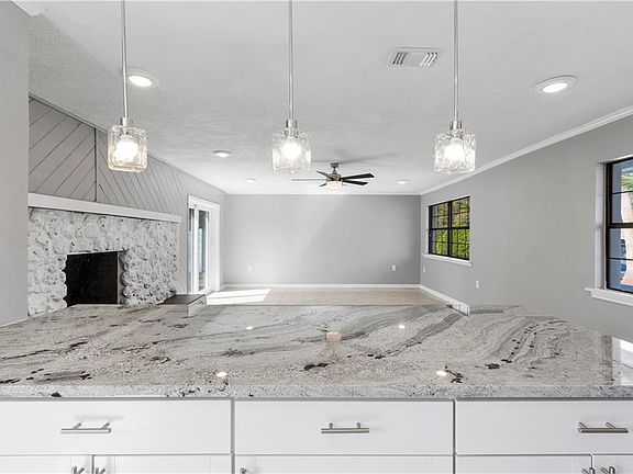 This recently renovated home in Sherwood Highlands is a must see! It has an open concept floor plan with plenty of living space. It features tile flooring throughout and a large fireplace at the center of the living room. The kitchen has been elegantly updated with new cabinets, upgraded granite counters, a large island with a wine fridge, and newer stainless steel appliances including a gas stove and pendant lights. Other important additions include a BRAND NEW ROOF with architectural shingles, a new AC, and new water heater. The master bedroom has sliding doors to the lanai, and an adjoining bath with new vanities, new fixtures and an upgraded shower head. The second bathroom has also been completely renovated with granite counter, custom sink, and all new fixtures. The backyard is large and partially fenced, it has a storage shed giving you extra space to store all of your gardening essentials. This home looks amazing, and is located close to shops, dining, and more. This one won't last long - don't miss your opportunity to make it yours!