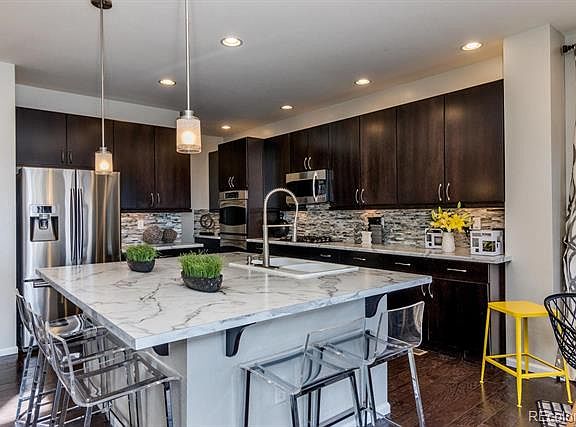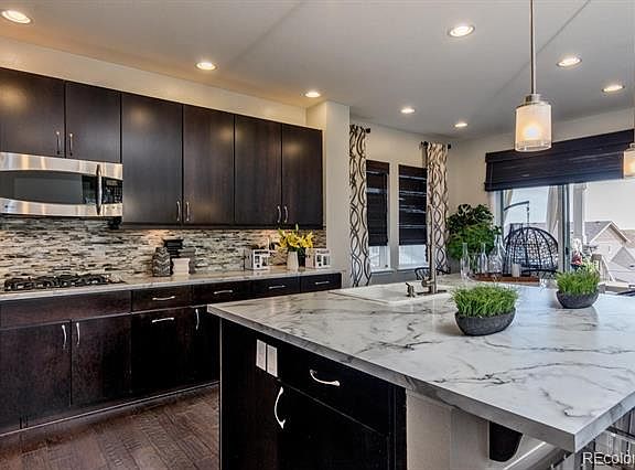 Amazing home w/ gorgeous mountain views. Open chef's kitchen with double ovens, gas range & pantry. Huge kitchen island w/ ample seating perfect for entertaining. Family room w/ vaulted ceilings, gas fireplace & fun updated light fixture. Main floor guest suite w/ private bedroom, bath & separate living room. Main floor office, 1/2 bath & mud room finish off the main level. Master suite in upper level w/ spectacular views. Master bath w/ oversized tile shower & walk-in closet. Loft area perfect for that second family room. 2 additional bedrooms, full bath w/ double sinks & laundry complete the upper level. Walk out basement w/ rough-in ready for your finishing touches. Beautiful wood floors throughout most of the main level plus loft & master suite. Covered deck w/ big fenced yard. Neighborhood park & baseball field next to home. Candelas has 2 community pools, 2 clubhouses w/ fitness facilities, numerous parks, trails, tennis court & Three Creeks K-8. This home is a must see!!