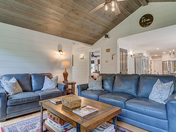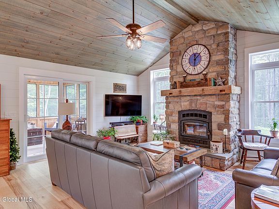 This 3 year old impeccable ranch house has it all- 77' shared lake access to Great Sacandaga Lake & a peaceful home setting, priv. backyard w/custom pavers & an oversize att. garage. The vaulted ceiling in the LR plus the cozy zero clearance wood fireplace lends itself to the Adirondack flair. The shiplap throughout gives a cottage feel. K & bathrooms boast custom cabinets. Kitchen has quartz countertops, a dual fuel range w/both gas & electric for the oven & a butcher block island. The screened in back porch is perfect for entertaining. Lake access is right across the street & is about a 4 minute walk. Dock slip incl. & beach is sandy. 8 acre parcel shared by 4 people to use trail to beach -taxes & ins shared. A must see property. Prequal or proof of funds required before showing.