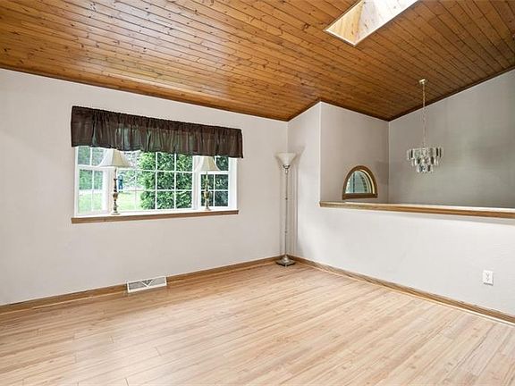 Cozy up under the protection of a tree-lined border that complements the many natural elements inside: from the generous and spacious ease of the great room to accommodating glass doors that lead to an ample and open elevated rear deck, overlooking enviable acreage you can call your own. Entertain and enjoy in grand scale within the 1000 square foot great room. Generously enhanced by an expansive, vaulted wooden ceiling and recessed lighting, follow the room's panoramic view to its dramatic floor-to-ceiling stone -faced log fireplace, voluminous windows extending throughout the room, while the entire space is underscored by well-insulated vinyl plank flooring with the look of natural bamboo. Solid oak kitchen comprises spacious cabinetry and counters. Main floor laundry. Finished lower level brightened by full-size windows and encompassing a family room, den with wet bar, full bath, storage rooms, and integral garage connection, as well as a sliding glass door into the back yard.