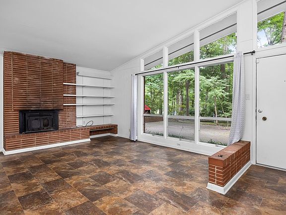 Welcome to this unique North Durham retreat on over 6 acres. Custom brick split level home provides all the needed space and storage, with full walk-out basement, while the grounds provide endless opportunities. Long private gated drive takes you to the homesite, which features a large parking area, covered carport for hobbies and shade, huge side patio w/fireplace, small pond, and extra shed. Inside enjoy the cozy family room with built-ins and wood burning stove, galley kitchen and dining area with windows galore. New roof 2019. Walk-out basement is heated and cooled. Enjoy meandering trails and paths on your wooded acreage or pop down to Durham for an evening show. This is it!