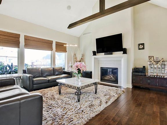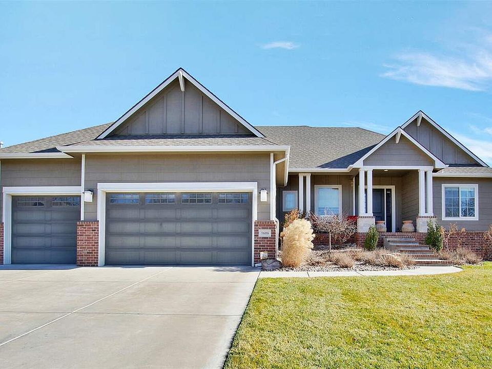 This beautiful Nies built 6BR, 3-1/2 BA home, located in the esteemed Stonebridge neighborhood is a must see! Great curb appeal with the most popular gray and white exterior with stone and brick and the covered front porch with sitting space are only the beginning. Upon entering the expansive foyer, you'll be captivated by the breathtaking 18ft vaulted ceilings, wood beams, rich hardwood flooring, white trim, and large picture windows along the back wall filling the open living space with natural light. The great room includes a gas fireplace with a beautiful white stone mantel and tile front and is open to the gourmet kitchen featuring a large center island with gorgeous white granite counter tops, beautiful white cabinetry, soft-close drawers, hidden walk-in pantry, double ovens, gas range, stainless vent hood and large granite sink. Beautiful glass tile backsplash and elegant fixtures, this kitchen truly does shine! The dining space is great for both everyday eating being open to the kitchen and big dinner parties being able to accommodate a full-size dining table and the door opens to the covered deck when you're ready to expand the party outdoors complete with speakers and water views! Off the back of the kitchen is a conveniently located powder bathroom, separate laundry room with built-in drop zone and the door to the 3-car garage. Retreat to the spacious master en-suite with new carpet, ceiling fan, large window and gorgeous spa-like master bath with 2-sink granite counter-top vanity, glass-tile backsplash, soft-close drawers, soaker tub, fabulous full tile walk-in shower with glass tile accents, bench and double shower heads, private toilet, built-in dresser, beautiful tile flooring and a walk-in closet with more built-ins and tons of space! On the opposite side of the house, you will find two additional spacious bedrooms, a full bathroom with granite counter tops and soft-close drawers and additional linen closet to complete the main level. The fully finished walk-out basement includes an expansive family room with gas fireplace with tile front, windows spanning the back of the room and a complete wet bar with pendant lights, granite counters, sink and dishwasher with upper and lower cabinets and tile flooring. Three additional very large bedrooms and a third full bathroom complete the lower level. One of the basement bedrooms is extra-large measuring 13.5' x 20' and could easily be used for a game room, exercise room or theatre room and is currently set up as a theatre room with speakers. Exterior amenities include irrigation well and sprinkler system. With new carpet throughout the house, this showstopper is on-point with today's trends and move-in ready! Sedgwick county taxes and already has 6 years of specials paid off, this fabulous home in the Andover school district is priced well below what it would cost to build today and is as good as new, showing like a model home! Don't miss this opportunity to get the most for your money and the most beautiful home!