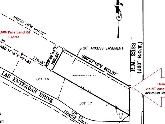 Interior rural parcel with access via a 603' non-exclusive access easement off of N Pace Bend Rd. Not in a sub-division. No HOA. Restricted to single family by the driveway easement. There are other easement requirements. Lookup the filed easement at tccsearch.org Grantor of agreement is Komir , Grantee is Carson. Agreement executed n 2015 Taking offers. DO NOT CALL, TEXT ONLY. Submit offers via email. No access through the private gated sub-division of Las Entradas. Driveway currently under construction on the private Easement. Please DO NOT Trespass onto Easement or adjacent private property. All appointments to view the property must be preceded with receipt by Seller of Buyers proof of funds. No public sewer available. Property will need septic and well. No connections to PEC electric at this time. No meter or transformer or electric pole on property. View Tax history at https://www.traviscad.org/property-search/ PID 865014.
