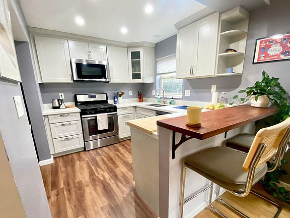 Light and bright 2 bed/1 bath with beautifully remodeled kitchen and bath, updated bedrooms in a 4 unit complex on a friendly street. Spacious living/dining area with large windows and hardwood floors, fully renovated kitchen with eat-in butcher block bar. Unit gets great light from both east and west windows. Kitchen features tons of storage, all new off white shaker cabinets, gorgeous white quartz countertops, dishwasher, convection oven/microwave/hood and luxury waterproof vinyl floor. Both bedrooms recently updated with the plushest carpet you’ve ever felt, one has two closets, the other includes one closet and new built-in wardrobe for ample storage. Bathroom features new dual sink vanity with white marble countertop, vintage-style tile floors, triple mirrored medicine cabinet, new toilet and deep soaking tub. New dimmable recessed lighting and light fixtures throughout the house. In-unit full size washer/dryer. Updated central heat with high efficiency furnace and tankless water heater. Additional storage space on premises. Gigabit fiber internet through Sonic. Shared outdoor space includes enclosed front patio/garden and large backyard with fruit trees and roses. The condo complex is full of great neighbors that make it really feel like a community. One block from Malcom X Elementary School and 4 blocks to Ashby BART (~6 min walk).