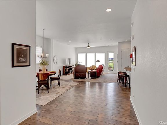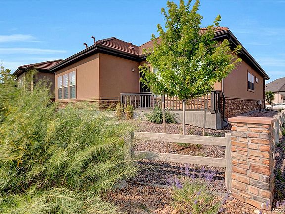 Anthem Ranch 55+, David Weekly Aurora Flooplan within 3 mins walk to the 30,000 sq ft recreation center, over 48 miles of trails and over 130 clubs. A plethora of upgrades including silhouette shades, gorgeous LVP gray flooring, extra tall ceilings and doors, gourmet kitchen, soft close drawers, pendant lighting over large kitchen island, stainless hood over cooktop, upgraded stainless steel appliances, white gorgeous cabinets going up to the ceiling with glass doors! Upgraded carpeting,ceiling fans, ceiling speakers(surround sound), mudroom area and separate utility room. Large master with walk-in closet and gorgeous walk-in shower with designer tile. Tall Linen closet in main bathroom for extra storage. 2nd bath has gorgeous granite counter, full bath with designer tile. Laundry room with washer, dryer and extra cabinets. 2 car garage, partially fenced, storm front door and front and back sitting porch and patio. No neighbor behind and next to walking trail Easy access to I-25, restaurants and shopping and amenities.