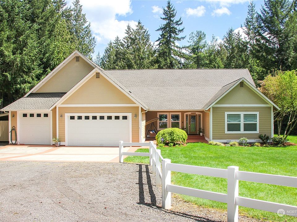 Finally one level living on a sunny 2+ acres centrally located between Poulsbo and Silverdale. This builders own home features all the touches anyone would need for comfortable living. The stamped concrete covered patio invites you into a very gracious entry with formal dining room. Hardwood floors flow into the vaulted great room with sun filled skylights. The kitchen has tile counters and backsplash with a large eat-in nook area. The primary suite has coffered ceilings and crown molding along with private access to back covered patio. It's ensuite has jetted tub, tile shower and walk-in closet. A Split floorplan creates privacy and the two bedrooms share a "jack and Jill" style bath. This is just a great home in a great location !
