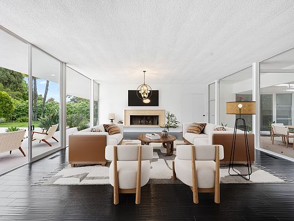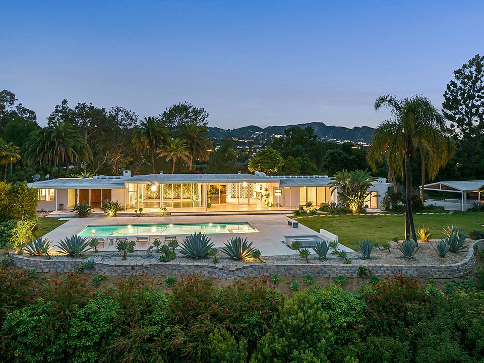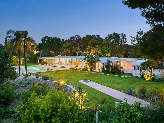 Stunning mid-century modern masterpiece located on one of the most coveted streets in Encino. This property is situated on a sprawling private lot that boasts breathtaking views of the Valley. Inside you will find a spacious open concept floor plan with walls of glass on either side that flood the space with natural light. Nearly every room in the home has direct access to either the backyard or one of two interior courtyards. The main living space consists of a sleek modern kitchen and living/dining room that's separated by a wet bar. The primary suite features a massive walk-in closet and spa-like bath with a private outdoor shower. Surrounded by lush mature landscaping, the private backyard oasis is an entertainers paradise. Lounge on the expansive patio deck or take a dip in the refreshing pool/spa. Additionally there is a large grassy yard, built-in fire pit and outdoor bathtub. Further amenities include a laundry room, detached guest suite with a full bathroom, large storage room, spacious motor court with gated entry and three car carport.