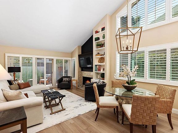 Nestled in the serene cul-de-sac of The Villas in Rancho Santa Fe, this property presents as an exquisite single-story two-bedroom condominium, beautifully refreshed to embody modern elegance. As an end unit, it enjoys abundant natural light, enhanced by newer double-paned windows that illuminate the airy, vaulted ceilings. The kitchen has been meticulously updated with KraftMaid cabinetry, sleek porcelain countertops and backsplash, and premium stainless steel Bosch appliances, including a gas cooktop with downdraft vent, a dishwasher, and a Blanco sink adorned with luxurious gold-tone fixtures and hardware. The home features wide plank light oak luxury vinyl flooring throughout, a new Trane HVAC system, and newly installed attic insulation. The living area is centered around a reimagined granite-framed fireplace, flanked by LED-lit built-in cabinetry, creating a warm and inviting ambiance. The front and rear courtyards have been thoughtfully landscaped, complete with low-voltage lighting to enhance the outdoor spaces. The attached garage offers built-in cabinets, attic storage, and an electric car outlet station. Located just a 9 Iron shot from the La Valle Coastal Club & Resort, residents can also enjoy the nearby guest parking, large community pool, and jacuzzi, making this property a true retreat in the heart of Whispering Palms.