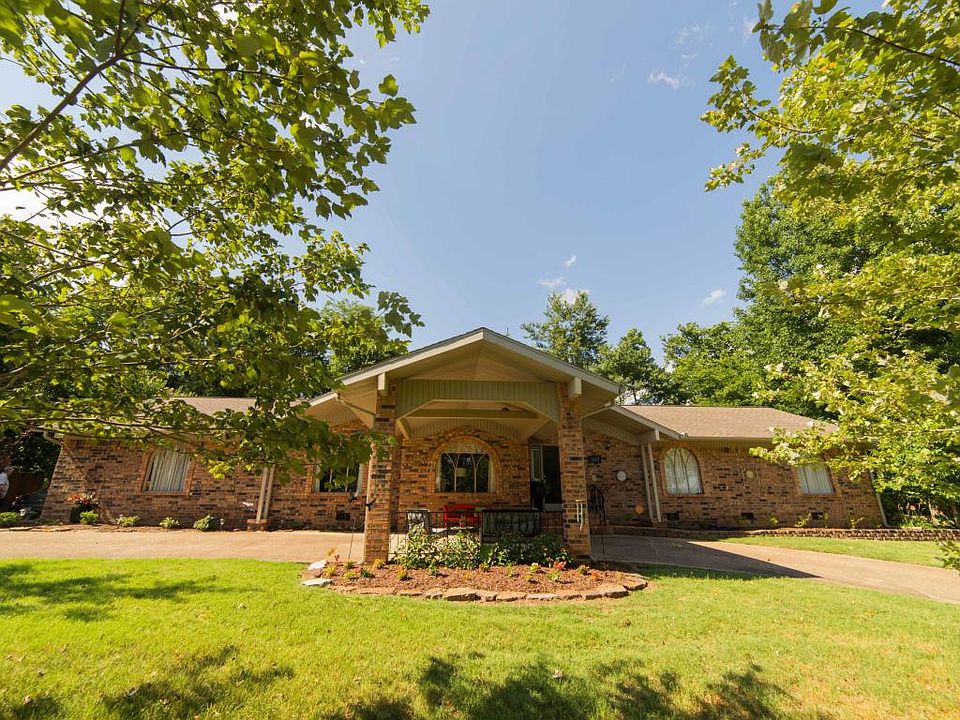 Beautiful setting and location! Brick home, nearly 2600 ft on one level, with circle driveway, 4 bedrooms and 2 bathrooms. Open kitchen and den area with gas fireplace. New countertops. Formal living room. All season large sun room on back of home with screens and glass windows. Fenced yard with play set. Storage shed.