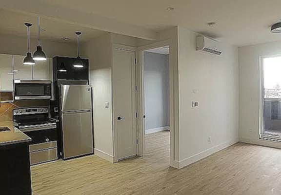 2 bedroom 1 bath The unit features an open kitchen with stainless steel appliances, hardwood floors, a huge spacious living space Building perks includes: lounge, game room, bike room, gym, laundry in basement & parking