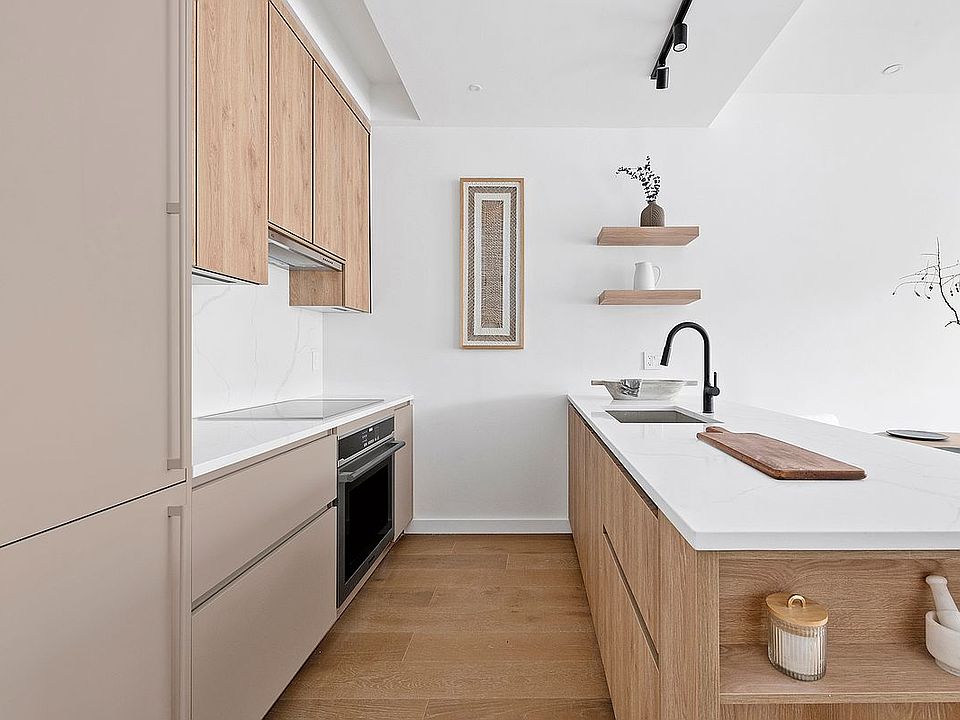Apartment 3A is a dream come true for anyone looking for a designer oversized 1-bedroom, 1-bathroom apartment. This sun-filled unit boasts 645 sq ft of living space, with 7.5 inch white oak floors that complement and incorporate the unit’s unique style. The open kitchen is a chef’s delight, outfitted with Blomberg appliances, including dishwasher, and a range/oven with vented XO hood. The custom cabinets provide plenty of storage for all your cooking needs, and the stainless steel sink sits in a well appointed quartz island with custom built in open storage. You will also appreciate the convenience of having a laundry closet with washer/dryer hookups. The unit comes with a deeded storage space.