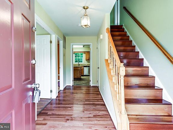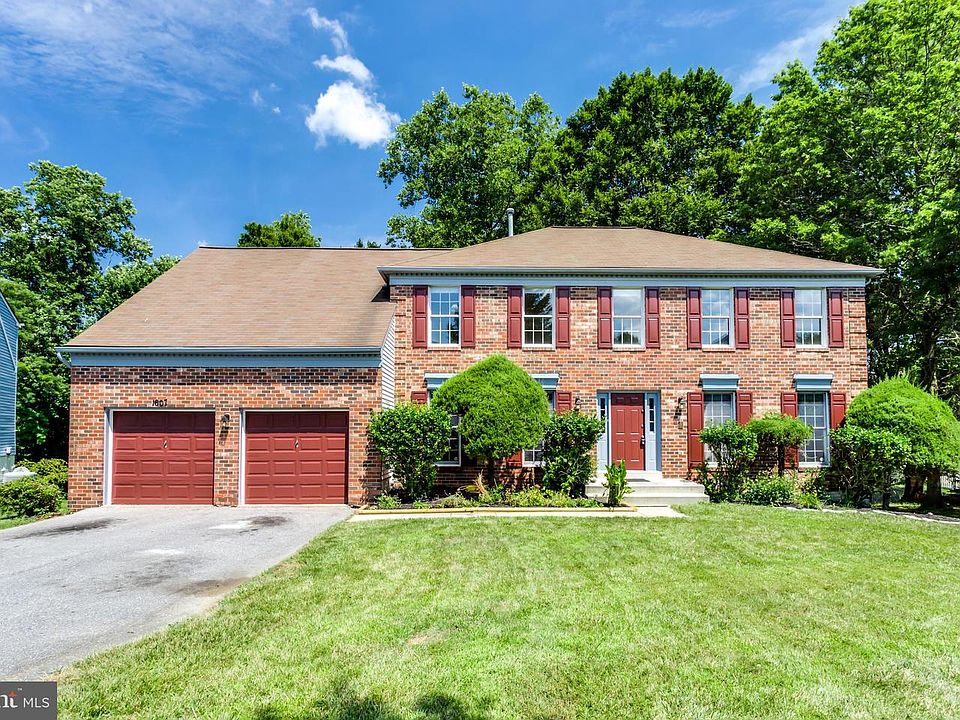 This 5 bed 2.5 bath brick-front colonial sits on a private flag lot, has a 2-car garage and offers gorgeous views off of the 3-story back deck. Near the house off of the sliding glass door is appx. a 5' x 12' deck area. The second level is a 15' x 20' section and the third is a 40' x 30' deck. The deck and backyard backs to the woods for total privacy. Inside through the sliding glass door, is the sunken family room. This room features hardwood floors, a two-story vaulted ceiling with two skylights, and an upper-level balcony overlook. The island kitchen has brand new granite countertops and stainless steel appliances, a wide & deep stainless steel sink with a garbage disposal, tile floors, and an extra countertop/desk area with built-in cabinets. Open breakfast nook area also with tile floors, and a bay window overlooking the private backyard. In addition, the entire interior has been freshly painted. The main level offers brand new hardwood throughout the foyer and the office. Office has a built-in bar area with recessed lights and large mirror. Large carpeted living room with recessed lighting, crown molding, & glass pocket doors leading to formal dining room. Dining room offers chair railings, crown molding, and was freshly painted. Main level laundry room with full-size washer/dryer and a utility sink. Upper level with cherry hardwood floors. A spacious master bedroom offers his & her walk in closets and brand new carpeting. The master bath has a tile surround soaking tub, recessed lighting, skylights, a custom mirror, a step-in shower with tile surround, and a double sink vanity with corian countertop. 3 additional bedrooms with brand new carpeting (one with a walk-in closet). Hall bathroom with a skylight, a vanity with corian countertops, a large mirror, and a tile surround tub. Large 5th bedroom with tile floors, and a 2-story family room overlook just outside the room. The walkout basement is unfinished, but offers a rough-in for a bathroom, room for expansion, and a brand new slider to the concrete landing area in the backyard. This home is perfect for outdoor entertainers and anyone searching for their own private oasis.