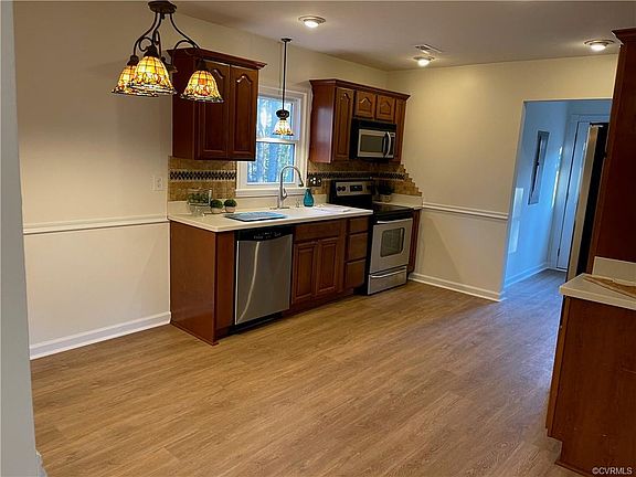 Great house and ready for YOU. Save on utilities with NEW heat pump! ALL NEW flooring with worry free waterproof LPV laminate and carpet in bedrooms. Big family room has gorgeous brick fireplace and diagonal wood feature wall. Kitchen has corian counters and cabinets with pull-out shelves, stainless appliances, tile backsplash. Outside new gravel in the driveway and walkways, ALL NEW exterior paint! Big lot is partly fenced in back and so private, no houses behind and pretty wooded views. Plenty of closets inside and tons of storage in tall crawl space.