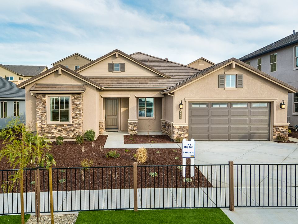 A NEW Anderson Home, the Big Sur is a large single-story home of 2,460 square feet, featuring many different room options and flexible living. As you walk through the covered porch and open the oversized entry-door a front guest bedroom with walk-in closet and full bathroom is situated for privacy. A formal dining room with an optional stonewall makes an impressive statement. The gourmet kitchen is a chef's delight, featuring 5 color options for granite slab kitchen countertops, premium Bosch stainless steel appliances, stunning tile flooring, two-tone paint in warm or cool tones, and oversized pantry - all standard features at Santana Ranch by Anderson Homes. The open great room features a cozy and convenient fireplace with options for stone accents. The master bedroom features a private spa-like bathroom with separate shower and soaking tub, his and her separate vanities, and a huge walk-in closet with built in organizers. Master and guest bathrooms include one of four standard piedrafina selections for shower surrounds and vanities. Heading to the garage, a large tandem stall provides space for a 3rd car, storage, or an ideal workshop area. Energy efficient features include drought tolerant landscaping, solar pre-wire, tankless water heaters, and more. The Big Sur features a total of 4 bedrooms and 3 bathrooms. Photos shown are of a model home and not the property at 1607 Santana Ranch Road. Visit the sales office at 1517 Santana Ranch Drive, open daily 11am-6pm, for a tour or call 831-636-9999 for more information. See our website at www.anderson-homes.com.