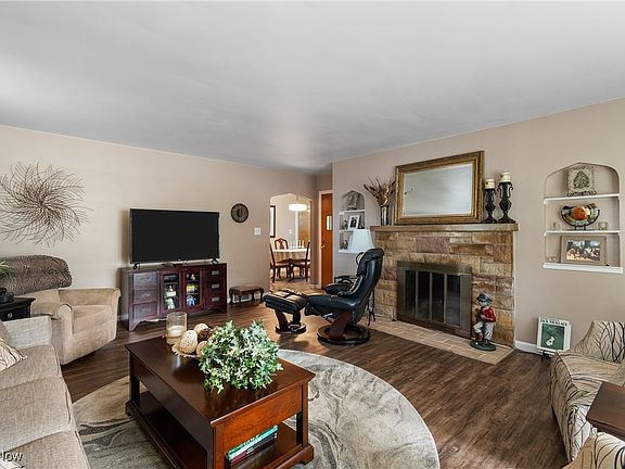 Covered front porchNeutral colorsFenced in rear yardPaver patioStone fireplaceDining roomNewer laminate floors