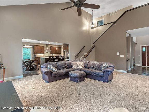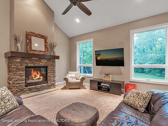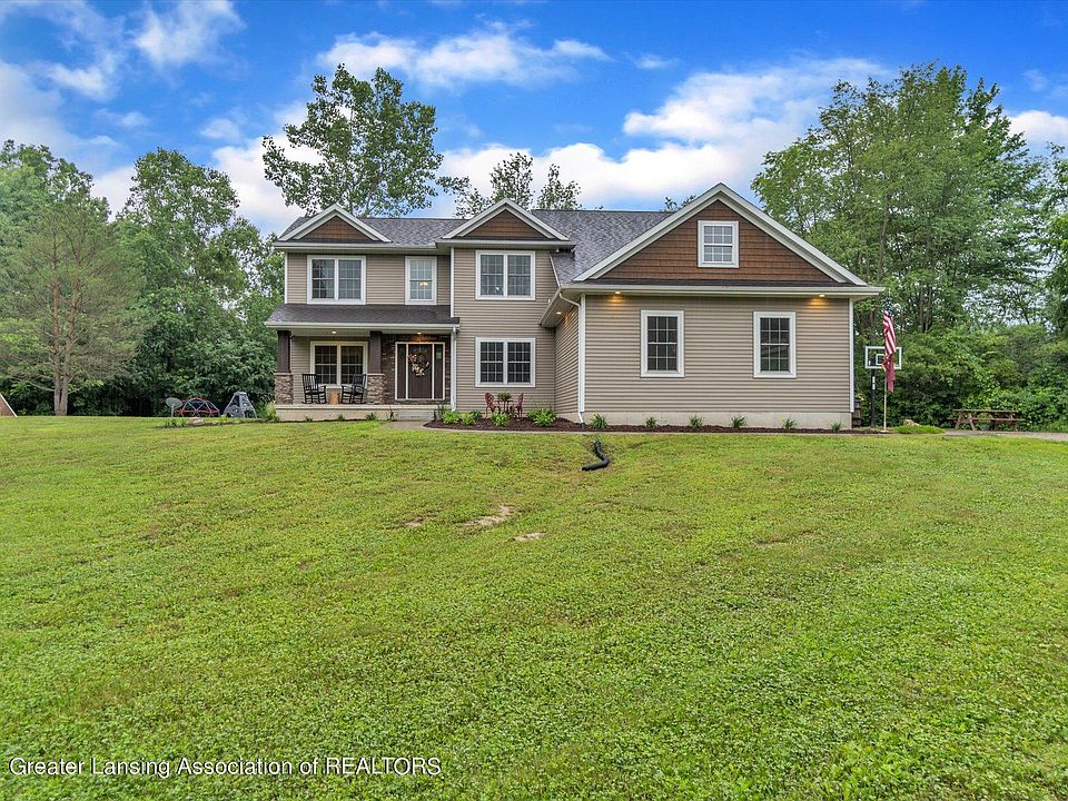 This East Lansing home features 4 beds, 2.5 baths, and 3,137 sq. feet on 7 acre wooded lot. Haslett Public Schools, Clinton County and Bath Township taxes! After driving down the private driveway, you'll notice the attached garage, basketball hoop, and cozy front porch. The large driveway offers an abundance of space for guests to park. Inside, you're greeted by stunning wood floors in the entryway which travel through the dining, kitchen and eating area. The spacious living area has tall ceilings, a stone gas fireplace, and neutral, warm colors that opens the room and makes it feel airy and inviting. The large, eat-in kitchen has plenty of space for a formal dining table and is fully equipped with gorgeous wood cabinets, a huge island/breakfast bar, stainless steel appliances, built-in convection oven, microwave and a walk-in pantry. A spacious mudroom coming from the garage is available with a variety of built-ins for storing coats, shoes, and keys. While the home offers 4 bedrooms, there is potential for a 5th bedroom as the office on the main floor can be converted and had a sizable closet. The washer and dryer are conveniently located on the second floor with built-ins for storage and a sink. The luxurious primary suite comes complete with a walk-in closet and a bathroom with tile in the walk-in, dual-head shower, an enclosed private space for the toilet, and a powder vanity. Downstairs, the enormous basement offers ample room for a home gym, seasonal supplies and a potential 6th bedroom as it just needs to be drywalled. An additional bathroom is ready to be finished off to your taste as well. Outside, a wide, private backyard includes a fire pit as it backs up to dense greenery. The home also features a generator hookup and plenty of room to build a large pole building if desired. Close to all major shopping, MSU, major highways. To see 16070 Center Rd in person, schedule a private showing with your favorite agent today and make sure you take the 3D tour!