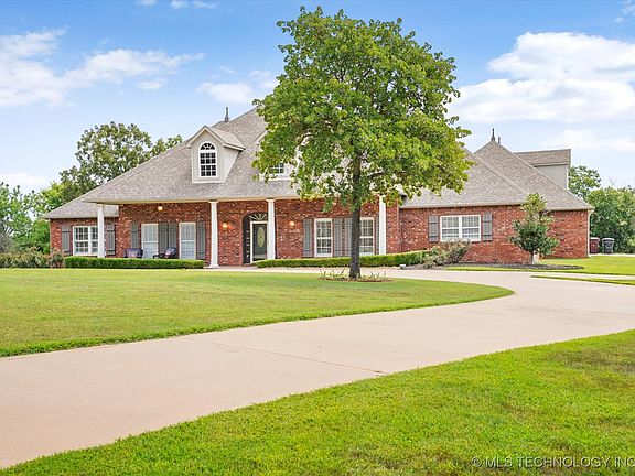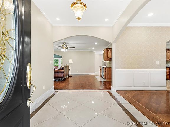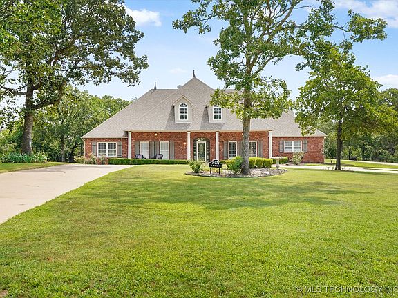 This beautifully appointed home on 1.819 acres (CH) has so much to offer! With 3 bedrooms/3 full baths and 1 half bath, 3 living areas (one of which is upstairs) and dedicated office AND 4 car tandem garage with tons of storage, shelves, sink and work area, AND a Safe Room! Amenities include lots of polished tile, plantation shutters, wood floors and even custom chevron pattern with brass in-lays, a wet bar, lots of crown molding, Office has access to 1/2 bath and to hall for secondary bedrooms that has a large storage closet, full bath and 2 large bedrooms with walk-in closets. Huge kitchen has granite counters, 2 pantries, custom cabinets with pull out drawers, island & nook. Kitchen & Wet bar have reverse osmosis water treatment system. Nook and