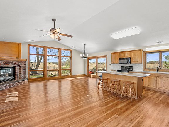 Come fall in love with this charming acreage situated on pavement! This zero entry home with no steps has a ton of room that you were not expecting! Walk into the living room and kitchen to enjoy a gorgeous view of rolling hills. Both areas have great space to entertain! This delightful property boasts 3 spacious bedrooms and 2.5 bathrooms. The master en-suite is a true retreat with a tiled shower and huge walk in closet. The rec room you will have so much fun in. It includes a gorgeous brick bar, perfect for hosting family and friends. Vehicle enthusiasts and hobbyists will appreciate the oversized 2 car garage, along with a substantial 36x54 outbuilding complemented by a 24x54 lean-to, offering ample space for projects and storage. Not far from Des Moines! This home is perfect for those looking for a peaceful, rural lifestyle with all the conveniences of modern living, this home is a rare find. Don't miss the opportunity to make it yours and create cherished memories in an enchanting setting.