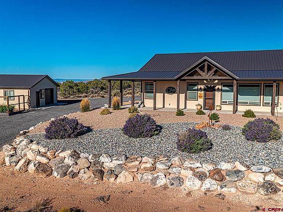 Built in 2017, this quality built, 1,880 square foot home has 3 bedrooms and 2 bathrooms. Don’t let the modest exterior fool you, this gorgeous home is very well constructed and has many high end finishes and custom features. An open concept floor plan features wood aspen accents and tile flooring with vaulted ceilings in the main area and 9’ ceilings in the bedrooms and bathrooms. Attic trusses were engineered to allow for additional attic storage with a drop down ladder access located in the attached 2 car garage. The garage features enough width to park a dually pick up truck and plenty of cabinet storage keeps it tidy and clean. The home has a pergola and sun cover on the back patio and a porch wraps around the front and side porches. Slab granite countertops, stainless steel high end appliances, custom closets, solid alder doors & trim with oil-rubbed bronze door hardware are just a few of the upgraded finishes that this home features. A hot tub sits on the side deck and is perfectly positioned to enjoy the best sunrises and sunsets that Western Colorado has to offer. The home sits on 4.6 acres and the stunning panoramic views include the West Elk Mountains to the east, the Gunnison Gorge and San Juan Mountains to the south and the Grand Mesa to the west. A detached shop building has electricity, heat, an additional laundry and an additional 1/2 bathroom. There is also an RV parking area with full 50A electric, water, septic and a propane hookup. This home has plenty of attention to detail and is a definite gem worth checking out.