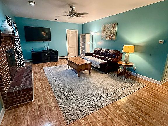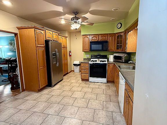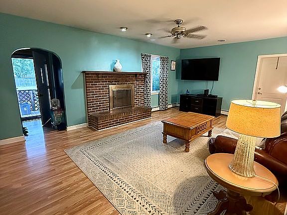 Inside, you’ll find a warm living room with a woodburning brick fireplace, a primary Master bedroom with walk-in closet and updated bath, plus two additional bedrooms with ample closet space. The kitchen has oak cabinetry, pantry, and full appliance package. Recessed lighting and ceiling fans add to the charm. The basement provides a laundry area and abundant storage space.