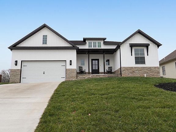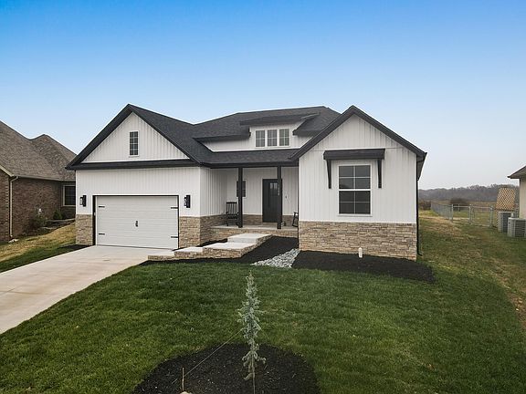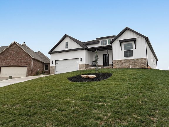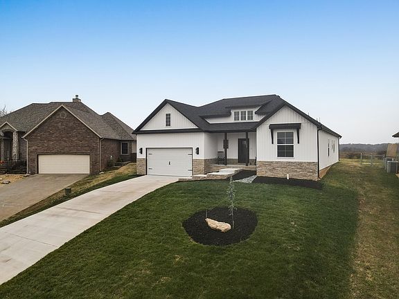 This gorgeous new construction home in the popular Ozark schools district will wow you from the moment you arrive. A covered front porch, freshly sodded yard, landscaping and beautiful oversized door greet you as if to say, come in and stay awhile. Don't let the look of a 2 car garage fool you, it is actually a 3 car tandem garage perfect for multiple vehicles or a dream workshop area. Craftsman inspired farmhouse style can be found inside and out this beautifully well-built home. The soaring ceilings in the grand entryway and throughout the main living areas, large open floorplan and split bedroom arrangement are just the beginning. A large living area with beautiful views and a stone fireplace is open to a generous well-appointed kitchen with granite counters, beautifully cabinetry a large island that includes bar seating and a walk-in pantry. The primary suite continues with the beautiful views and a gorgeous bath with walk-in shower, soaker tub, dual vanity, water closet and dream walk-in closet. You will find two additional well-sized bedrooms and an additional bath with shower/tub to complete the split bedroom arrangement. A nice oversized laundry room is central to the home. A large covered patio perfect for entertaining can be accessed from the main living areas and with no houses behind you the views go on for days. A HE furnace and water heater are the icing on the cake. You do not want to miss the well-built, high-quality home.