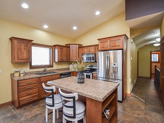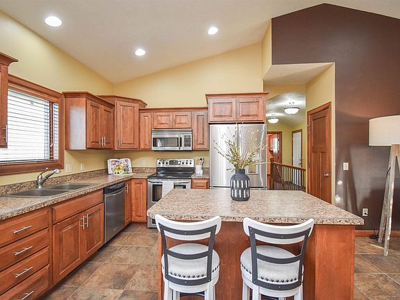 Welcome to your dream home nestled in the heart of tranquility! This stunning ranch walkout boasts 4 bedrooms, with 3 conveniently located on the main floor for easy accessibility. Pull into your spacious 3-stall garage, greeted by a beautifully stained concrete driveway and walkway leading to your front door. The large covered front porch invites you to unwind and enjoy the serenity of your surroundings. Step inside to discover vaulted ceilings in the living and dining areas, creating an open and airy atmosphere that welcomes natural light. The lower level, adorned with 9-foot ceilings, houses a family room equipped with a wet bar and built-in speakers, perfect for entertaining guests or cozy family gatherings. The outdoor space is a true retreat, featuring a paver fire pit patio where you can relax and enjoy the crisp evening air. Plus, revel in the privacy of having no backyard neighbors, allowing you to fully immerse yourself in the peace and quiet of your own oasis.